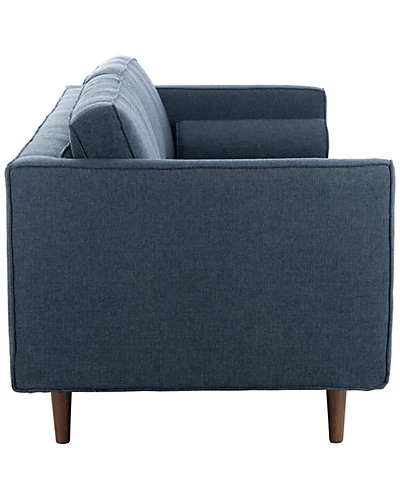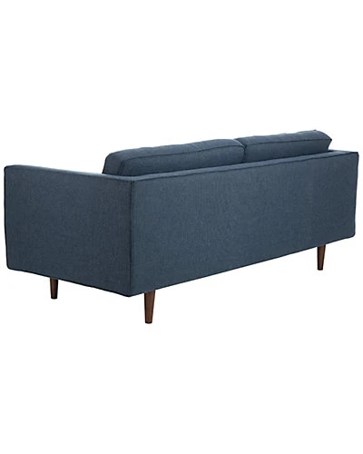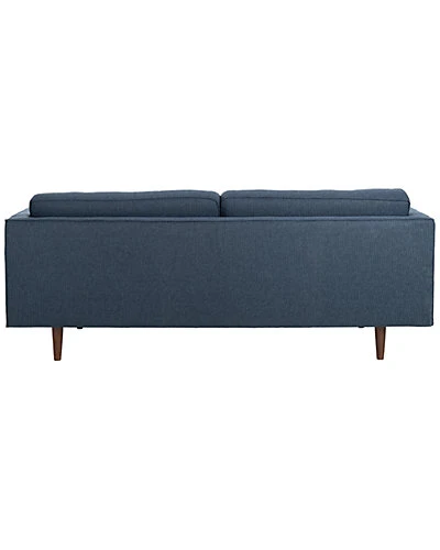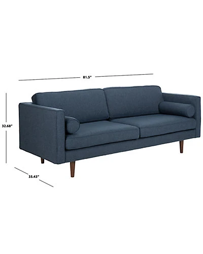 - The deluxe retro style of this mid-century sofa brings character and craftsmanship to any living room. Its four chic, dark blue cushions are generously upholstered and outfitted with complimentary bolster pillows. Its wood legs add warmth and charm.
