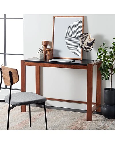 - This Halleck Desk was perfectly styled for those who desire classic simplicity. Hallecks jet black surface gives a modern edge to its warm brown Parsons frame, bringing a touch of utilitarian industrial chic to any workspace.