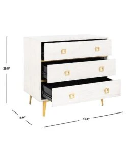 - A masterful melange of styles, this Katia Chest upgrades any room with fresh contemporary flair. Finely crafted to highlight the softly flowing wood grain and whitewash finish, Katia’s three spacious drawers make for easy organization. Gold splayed legs and matching square pulls add a retro chic touch.