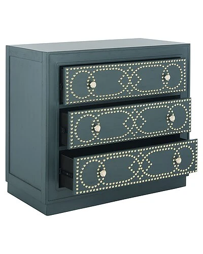 - Add designer style to the bedroom with this modern 3 drawer chest. Inspired by the work of master artisans, its intricate gold nailhead design and deluxe gold handles, complements its steel teal finish. Generous storage makes it a contemporary classic.