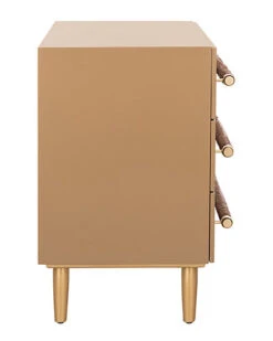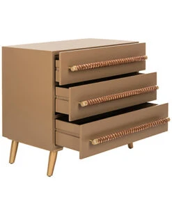 - Design details: Bring natural style to the bedroom or living room with this contemporary 3-drawer chest or nightstand. Finely crafted with light brown wood and retro-style legs, its generous drawers feature pulls with faux leather accents in a complementary brown hue.